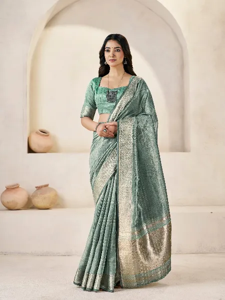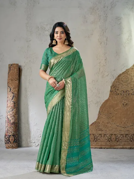 Elegant Linen Saree in Sea Green With Gold Zari Weaving and Blouse