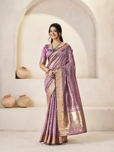 Elegant Linen Saree in Dusty Purple With Gold Zari Weaving and Blouse