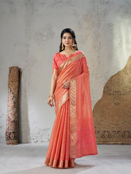 Elegant Linen Saree in Peach With Gold Zari Weaving and Blouse