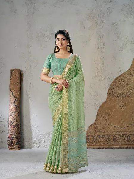 Beautiful Linen Saree in Pista With Gold Zari Weaving and Blouse Designer