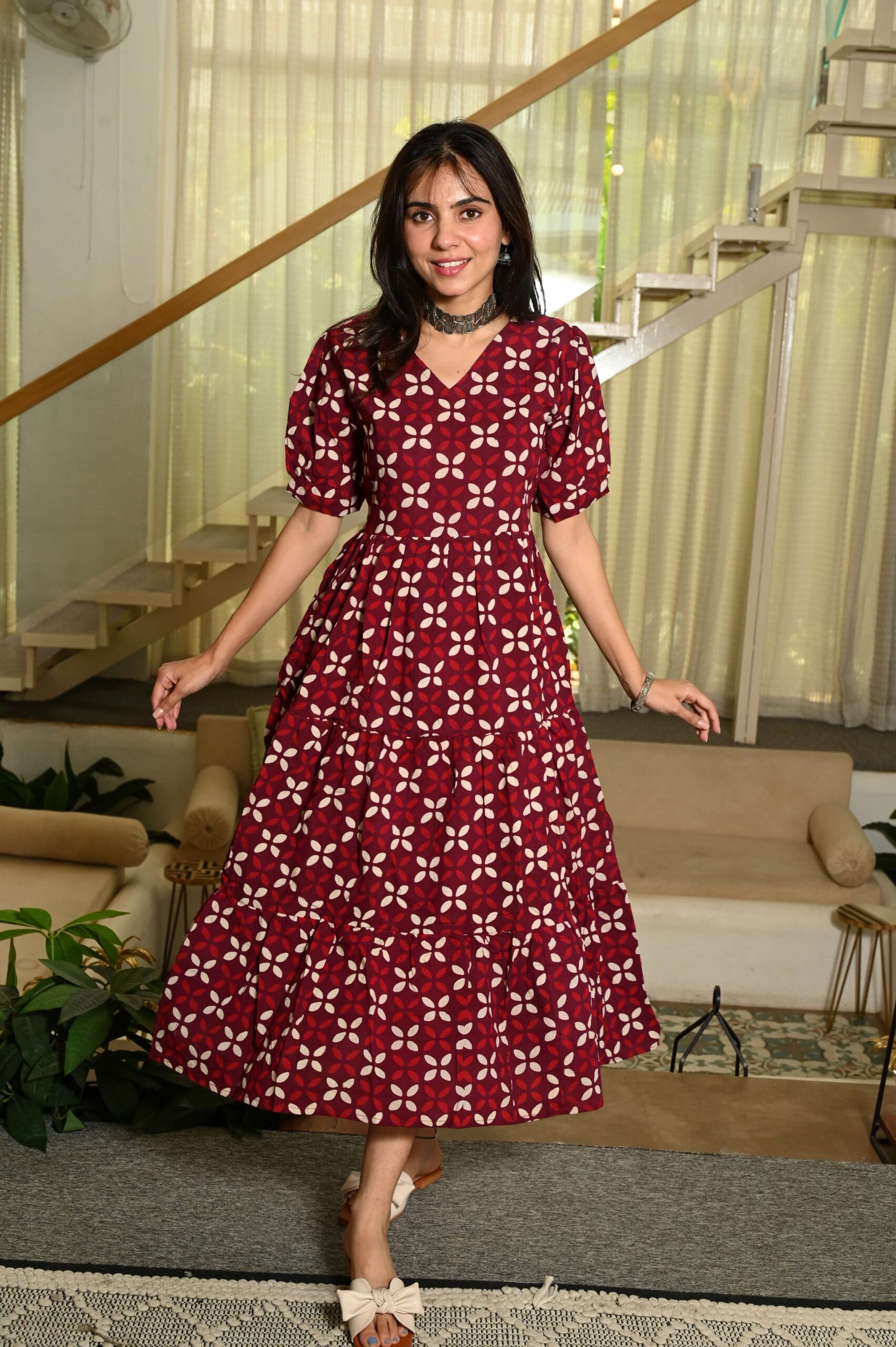 Maroon Printed Cotton Anarkali Maxi Dress with Puff Sleeves Elegant Casual Wear