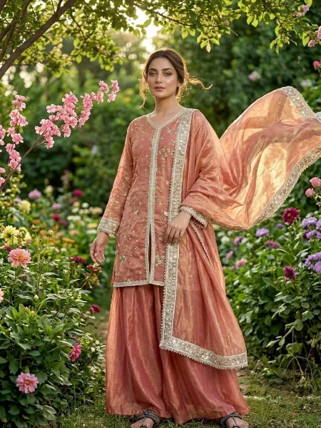 Peach Embroidered Palazzo Suit Set with Lace Border Dupatta