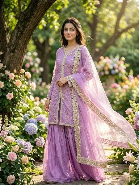 Lavender Embroidered Palazzo Suit Set with Lace Border Dupatta