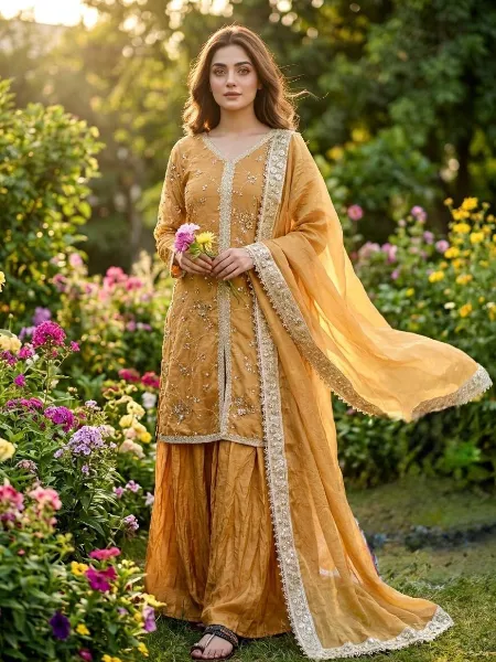 Mustard Embroidered Palazzo Suit Set with Lace Border Dupatta
