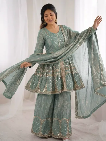 Sea Green Fendi Silk Embroidery Sequence Kurta With Palazzo and Dupatta