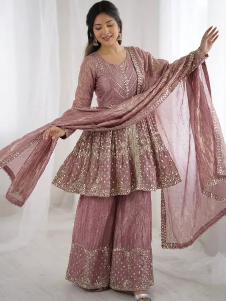 Dusty Pink Fendi Silk Embroidery Sequence Kurta With Palazzo and Dupatta