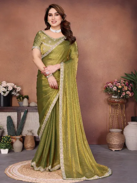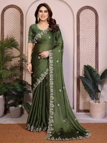 Mehendi Saree in Satin Chiffon With Sequins Cording Embroidery Wedding Guest Saree