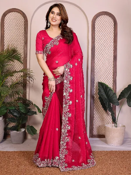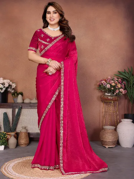 Pink Saree in Fendy Chiffon With Embroidery and Swarovski Stone Indian Saree