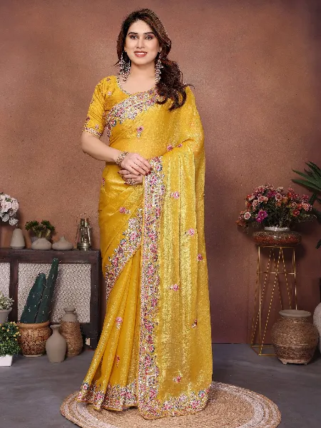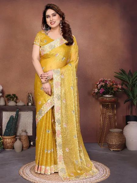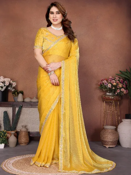 Yellow Saree in Fendy Chiffon With Swarovski Stone and Embroidery Indian Saree