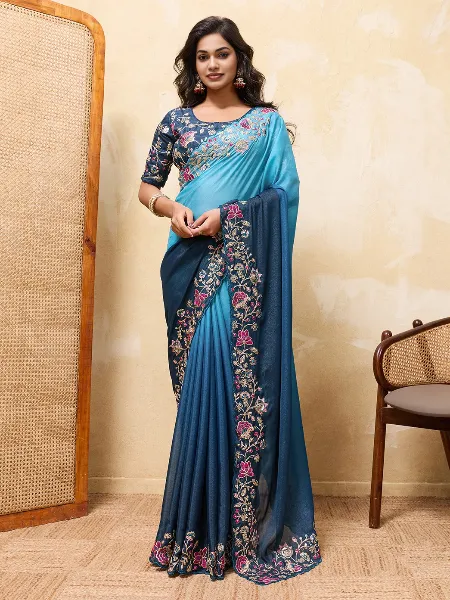 Blue Saree in Fendy Chiffon With Embroidery and Swarovski Stone Indian Saree