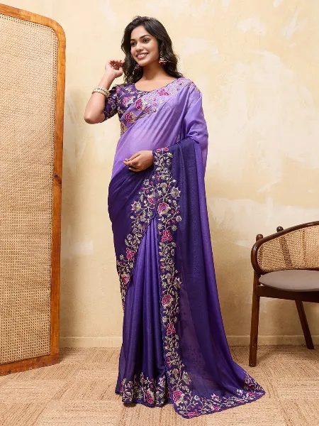 Purple Soft Georgette Saree With Cording Sequins Embroidery and Heavy Blouse