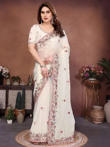 White Fendi Chiffon Saree With Cording Sequins Embroidery and Blouse