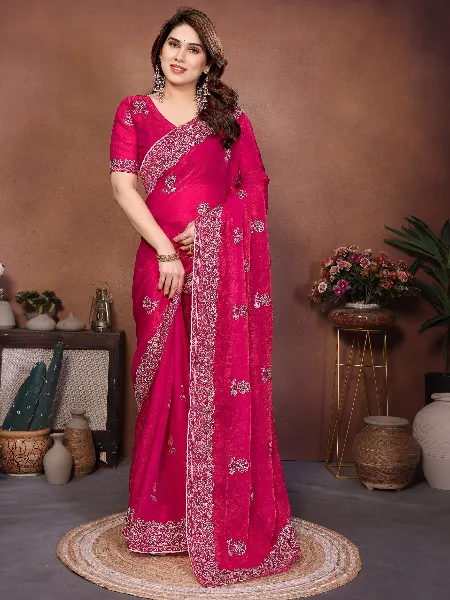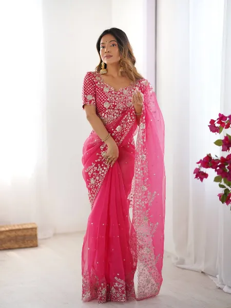 Pink Color Saree in Organza With Thread Sequence Work Indian Saree for Wedding