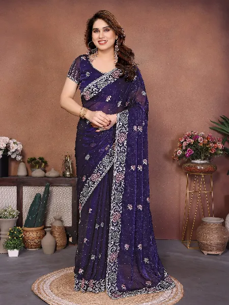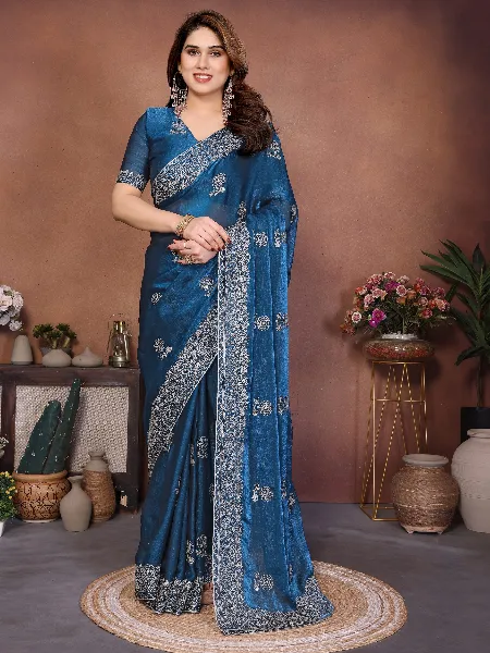 Blue Saree in Fendy Chiffon With Swarovski Stone and Embroidery Indian Saree