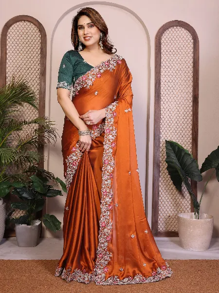Indian Saree With Heavy Embroidery of Floral in Rust Orange Ethnic Saree Gift for Her