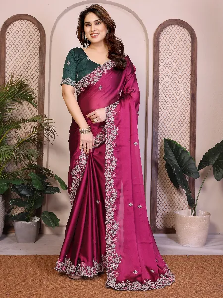 Indian Saree With Floral Embroidery of Pink Fendi Chiffon Ethnic Saree Gift for Her