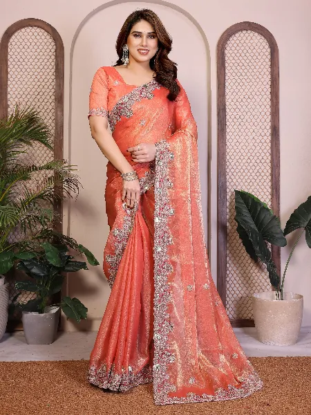 Indian Saree With Floral Embroidery of Peach Fendi Chiffon Ethnic Saree Gift for Her
