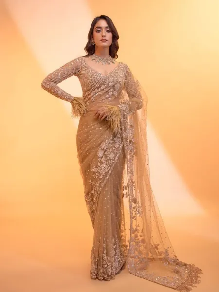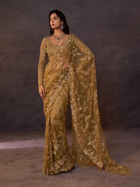 Designer Saree in Copper Gold Chiffon With Beads Sequins Work Wedding Saree for Women